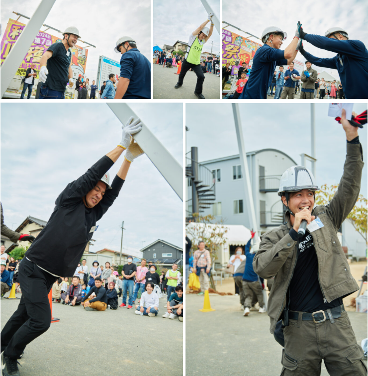 長い柱をグッと起こして、どこまで高く上げられるかを競います。会場は一瞬しん…と静まり、グッと力を込める瞬間に大きな拍手と声援。成功したときの達成感は特別なものです。