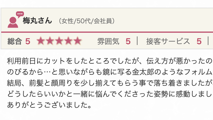 「どうしたらいいかと一緒に悩んでくださった姿勢に感動しました。もう少しのびたらまたお願いしたいと思います。ありがとうございました。」